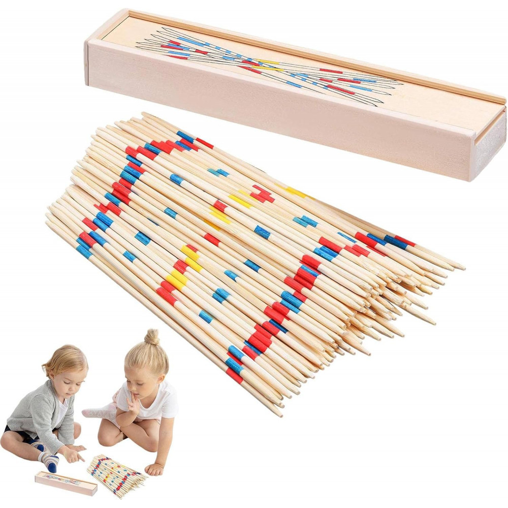 Game provides hours of fun for one or more players. This simple yet classic game hones hand-eye coordination and helps develop a child's fine motor skills. The game consists of 41 thin wooden sticks in assorted colors, each measuring 9.5-inches long. A handsome wooden storage case keeps the sticks together when not in use. This toy is suitable for indoor or outdoor play.